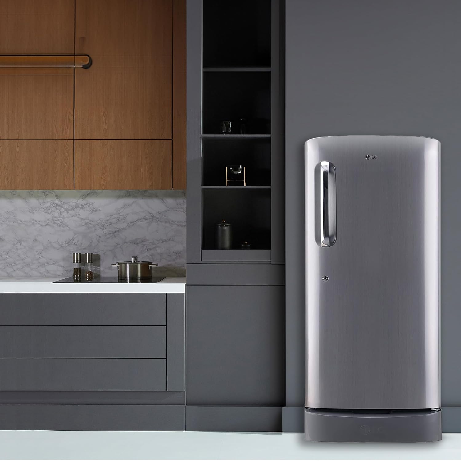 LG 185 L 5 Star Inverter Direct-Cool Single Door Refrigerator (2023 Model, GL-D201APZU, Shiny Steel, Base stand with drawer)
